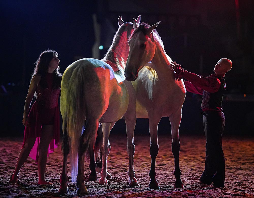 Dans l'écrin de lumière du Zagal Cabaret, laissez-vous transporter par les performances à couper le souffle de nos voltigeurs et cascadeurs d'exception. Découvrez la perfection des tableaux de dressage et de haute école, où chaque mouvement est une symphonie de grâce et de précision, et où la complicité entre l'homme et le cheval crée une évidence élégante et harmonieuse.