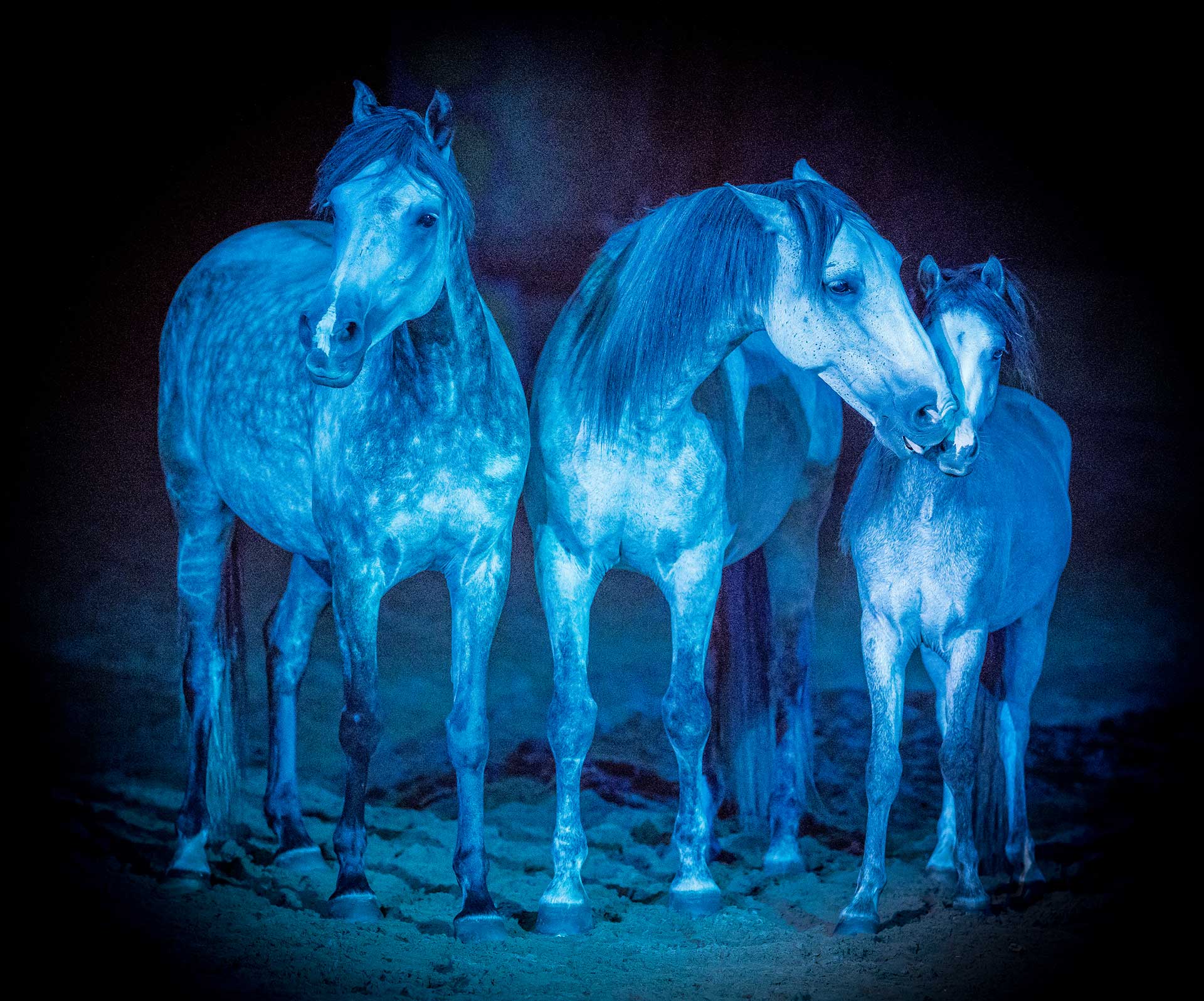 Du plus petit au plus lourd, du cheval Pure Race Espagnol au Pur Sang Arabe, du cheval bien né aux chevaux sans origine définie, tous les chevaux du Zagal Cabaret ont reçu une éducation et un dressage spécifique pour la création équestre. Montés, attelés ou en liberté, dans la lumière, en ombres chinoises ou entourés de feu.