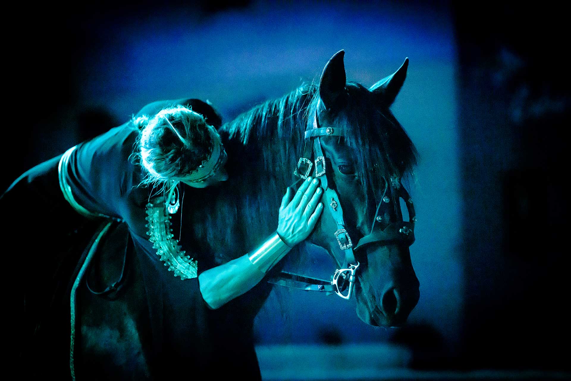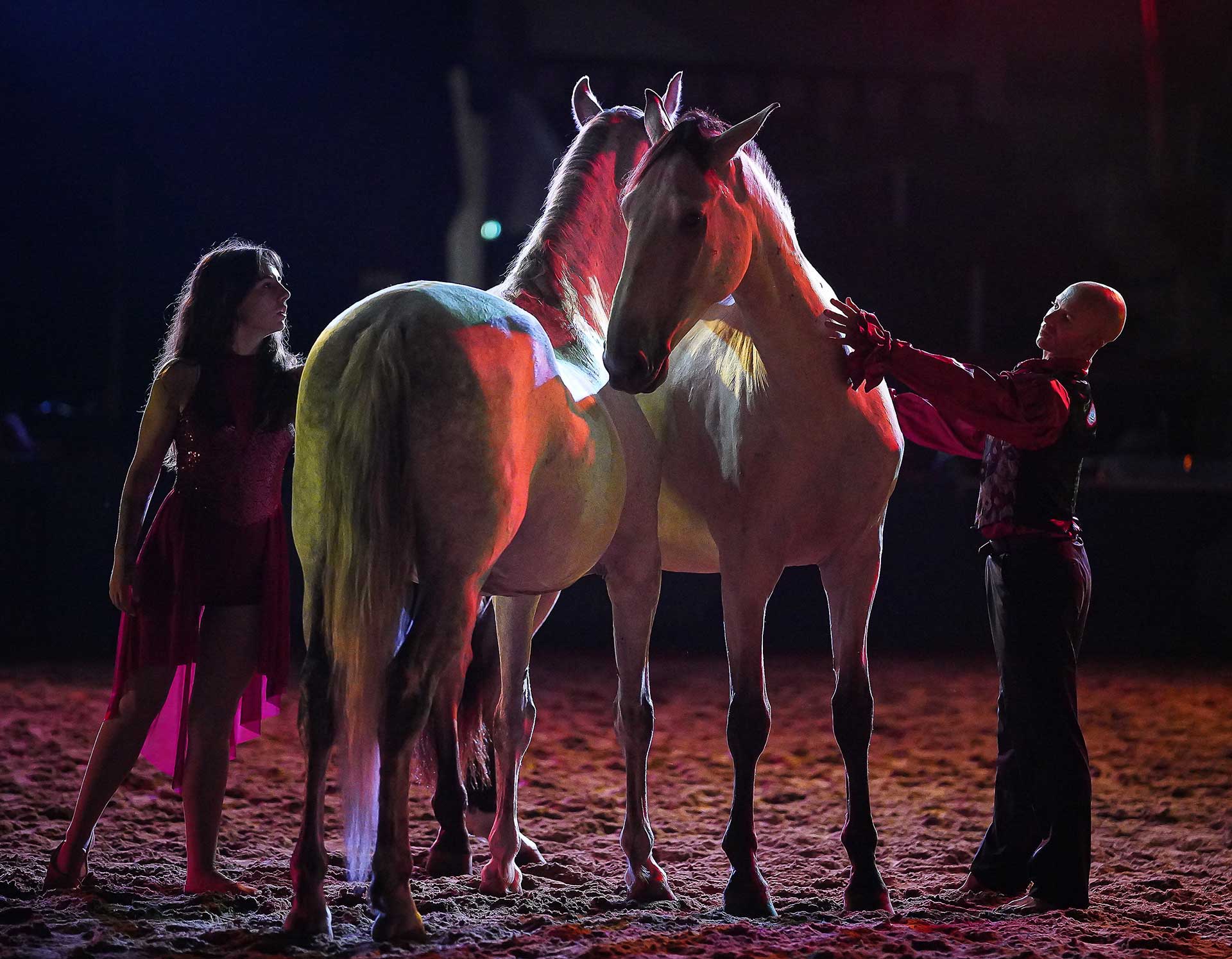 Du plus petit au plus lourd, du cheval Pure Race Espagnol au Pur Sang Arabe, du cheval bien né aux chevaux sans origine définie, tous les chevaux du Zagal Cabaret ont reçu une éducation et un dressage spécifique pour la création équestre. Montés, attelés ou en liberté, dans la lumière, en ombres chinoises ou entourés de feu.